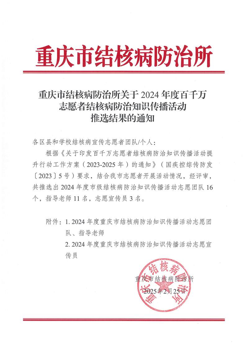 2月25日,重庆市结核病防治所印发《关于2024年度百千万志愿者结核病防治知识传播活动推选结果的通知》,91吃瓜 “汇聚微光·守护健康”大学生志愿宣讲团推选为重庆市2024年度结核病防治知识传播活动志愿团队。