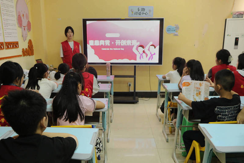“回望1949年10月1日,五星红旗第一次在天安门广场冉冉升起,站起来了的中国人民在神州大地开启了一个新的纪元......”志愿者们通过图片展示、视频展播等形式,带领小朋友们直观感受党和国家事业取得历史性成就、发生历史性变革,引导孩子们大力传承红色基因、传承中华文脉、传承奋斗精神,为强国建设、民族复兴伟业时刻准备着,努力成长为德智体美劳全面发展的社会主义建设者和接班人。