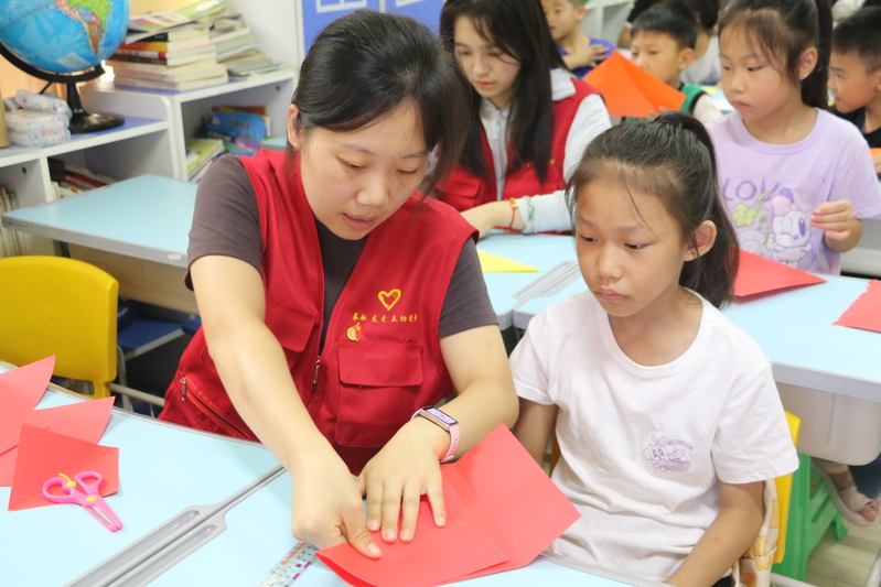 趣味手工环节,志愿者与小朋友们一起制作“五星红旗”和“中国心”折纸,孩子们以独特的方式礼赞祖国,表达对祖国的热爱和对未来的憧憬。
