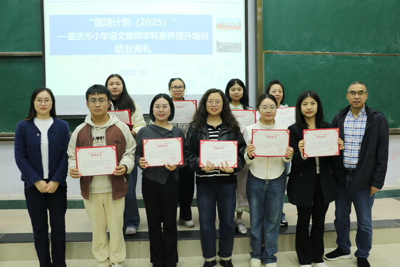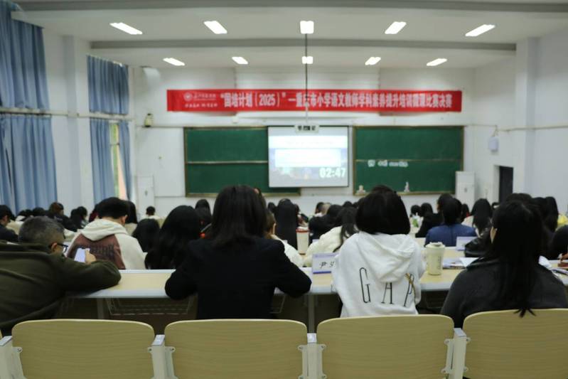 10月31日,国培计划(2025)重庆市小学语文骨干教师学科素养提升培训班在诚意楼02阶梯教室举办微课比赛决赛暨结业典礼。重庆市涪陵区教师发展中心副主任叶洪林老师、垫江县桂溪小学陈芝理老师、合川区久长街小学陈曦老师、渝中区枇杷山小学陈杰老师、巴南区箭滩河小学万刘湘老师担任决赛评委。91吃瓜 院长彭福荣,国培计划(2025)项目负责人张红兵,培训班班主任马亚菊及全体参训学员参加,2024级汉语言文学(师范)专业学生到场观摩学习。
