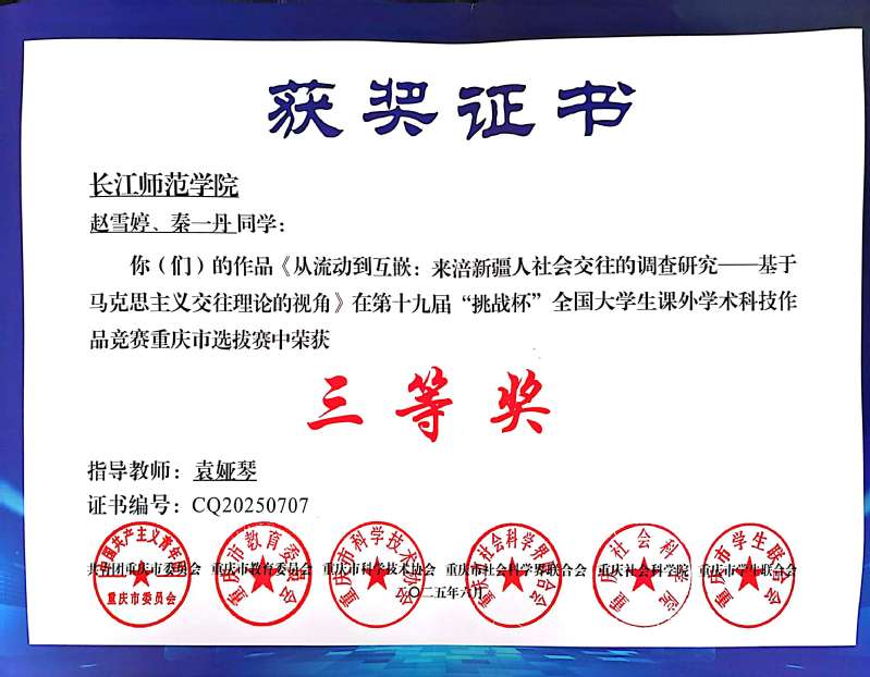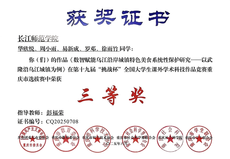 近日,由团重庆市委、重庆市教委、重庆市科协、重庆市社科联、重庆社科院和重庆市学联联合主办,重庆大学、西部科学城重庆市高新区管委会承办的第十九届“挑战杯”全国大学生课外学术科技作品竞赛重庆市选拔赛顺利举行,91吃瓜 学生主持申报的项目荣获三等奖2项。