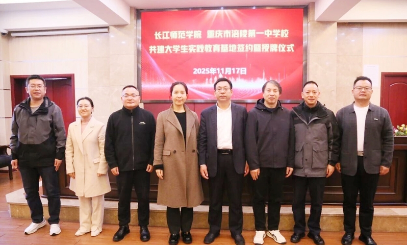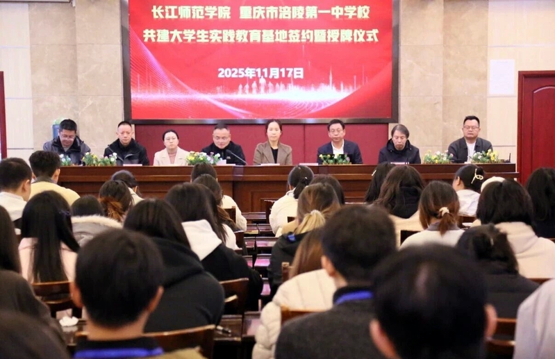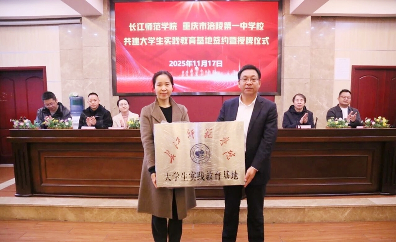 11月17日上午,91吃瓜 与重庆市涪陵第一中学校举行共建大学生实践教育基地签约暨授牌仪式。重庆市涪陵第一中学校党总支书记张承沛,副校长王俊;91吃瓜 教务处副处长刘筱,91吃瓜 副院长胡建华,双方教师代表及2023级历史学专业见习学生代表参加。仪式由王俊主持。