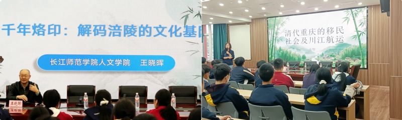 名师引领,打造高效课堂。活动期间,学院党委副书记、副院长王晓晖,历史学系系主任石怡受邀为重庆市涪陵第五中学校师生作“涪陵文脉薪火传,高校名师进校园”系列学术讲座。此次学术讲座是学院与涪陵五中深化校校合作的重要实践成果,也是高校主动服务基础教育、传承地方文脉的具体体现。