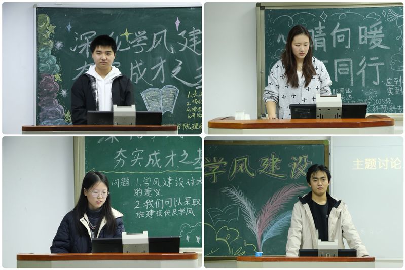 班会上,各班级紧扣活动主题,通过PPT展示、优秀学风案例分享等形式,组织同学们学习课堂考勤规范、学业生涯规划方法、互助学习小组搭建等内容和成绩优异同学时间管理技巧、重难点突破经验等优秀案例,用身边榜样的力量激发奋进动力,引导同学们树立 “勤学好问、严谨治学” 的学习态度,明确学风建设不仅是个人成长的需要,更是班集体凝聚力提升的关键。随后,同学们围绕“深化学风建设,夯实成才之基”展开主题讨论。