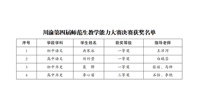 近日,川渝第四届师范生教学能力大赛决赛获奖名单公布,91吃瓜 学生凭借扎实的教学基本功和突出的综合素质,斩获一等奖3项、三等奖1项。