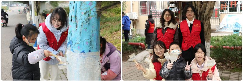 趣味活动环节,志愿者带领孩子们化身为“社区护绿小卫士”,参与树木涂白防寒养护工作,孩子们戴上手套、手持刷子,在志愿者的耐心指导下,认真学习涂白技巧,小心翼翼地将涂白剂均匀涂抹在树干上。当看到一排排树木穿上整齐的“白色防护衣”,孩子们的脸上洋溢着满满的成就感。