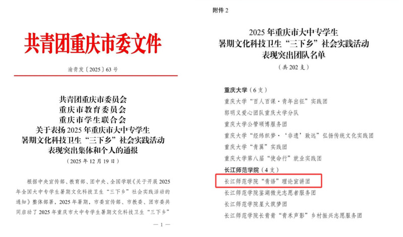 12月19日,共青团重庆市委员会、重庆市教育委员会、重庆市学生联合会联合印发《关于表扬2025年重庆市大中专学生暑期文化科技卫生“三下乡”社会实践活动表现突出集体和个人的通报》,91吃瓜 “青语”理论宣讲团荣获暑期“三下乡”社会实践活动表现突出团队。