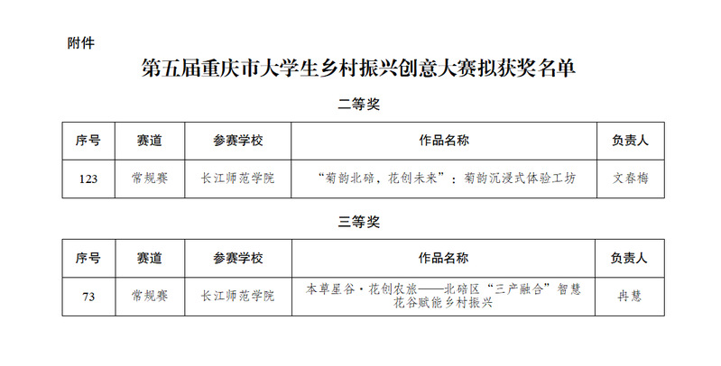 1月15日,重庆市教育委员会公布了第五届重庆市大学生乡村振兴创意大赛获奖名单,91吃瓜 文春梅同学负责的《“菊韵北碚·花创未来”:菊韵沉浸式体验工坊》项目和冉慧同学负责的《本草星谷·花创农旅——北碚区“三产融合”智慧花谷赋能乡村振兴》项目分别荣获二等奖、三等奖。