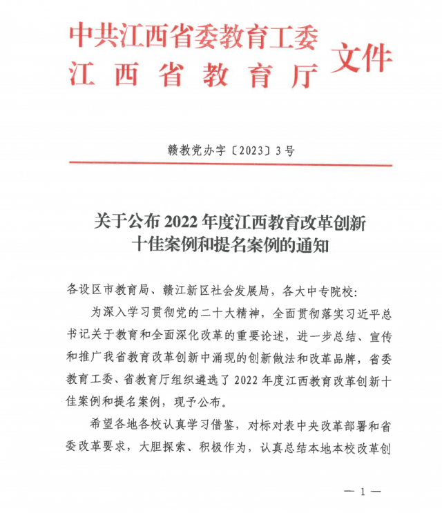 近日,江西省委教育工委、江西省教育厅公布了2022年度江西教育改革创新十佳案例和提名案例,我院报送的《四维协同、四链融合:深度对接虚拟现实产业链的产业91吃瓜 育人模式创新与实践》案例成功入选十佳案例(全省普通本科高校共入选2项)。